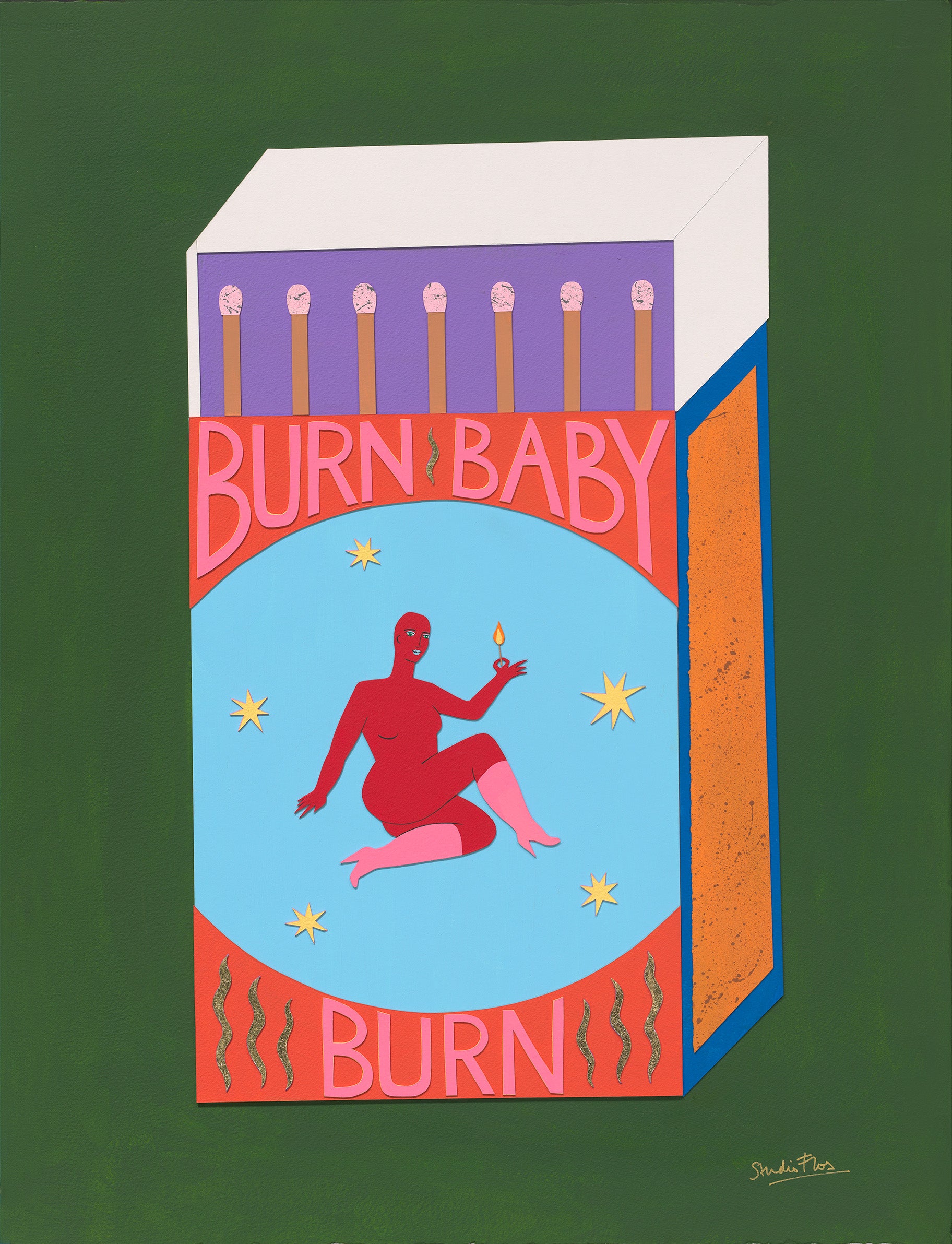 It is a high quality reproduction of my original painting, 'Burn Baby Burn'. This print has a white border.