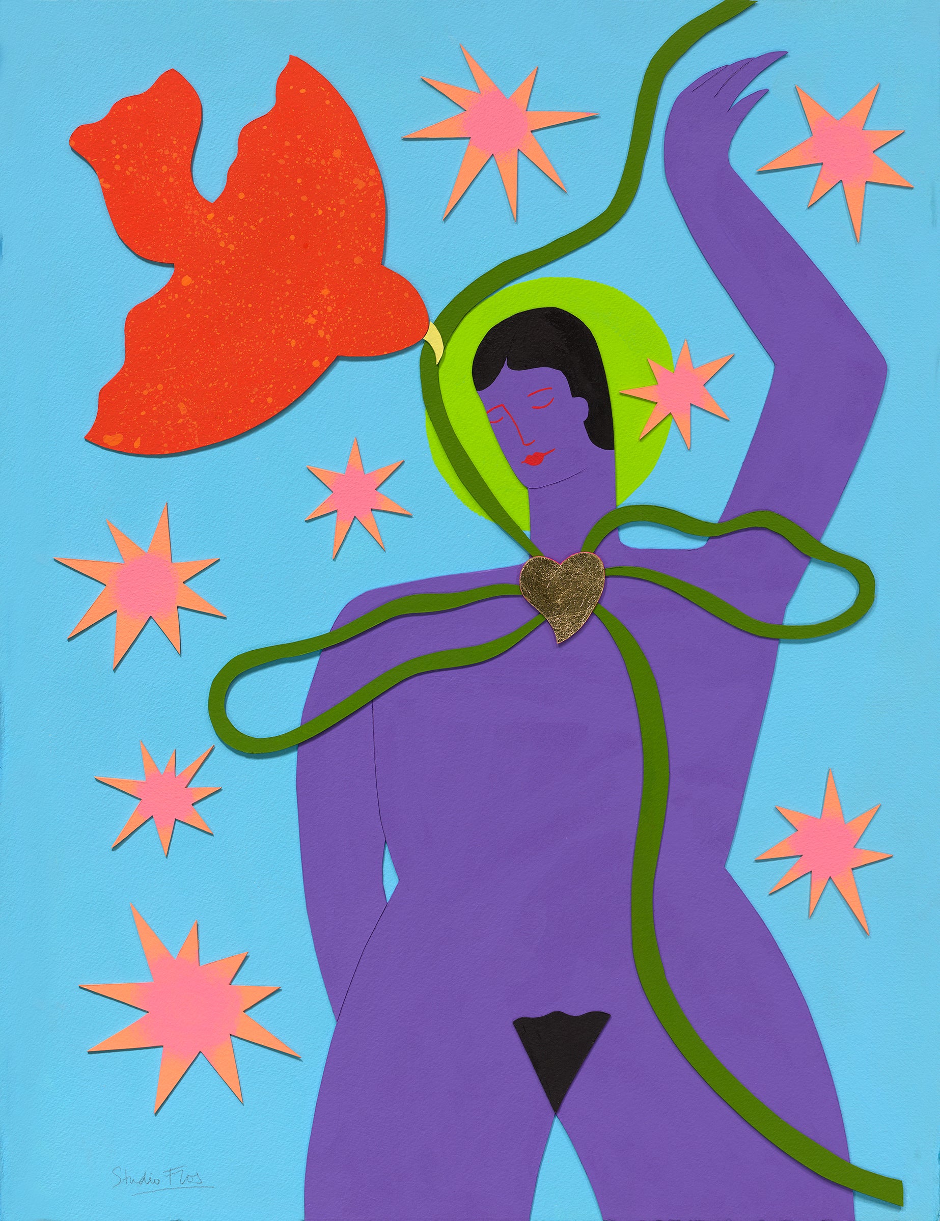 This work is an ode to personal growth and finding a sense of self. I was inspired to create this piece by going through big changes in my own life. The bird is shown releasing the figure from their ties, we can imagine the bird flying away with the ribbon.